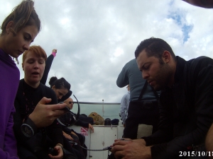 Cate approfitta dell’intervallo di superficie per una veloce spiegazione sul funzionamento del computer subacqueo.